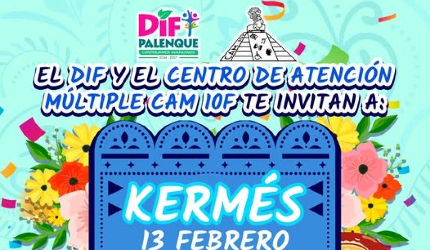 El DIF Municipal de Palenque, que preside la Arquitecta Nayeli Hernández Morales, en coordinación con el Centro de Atención Múltiple CAM 10F, invitan a una kermes este 13 de Febrero a partir de las 5:00 p.m. en la plaza del parque central de esta ciudad, apoyemos esta noble causa y al emprendimiento de nuestros jóvenes con discapacidad, asiste con toda la familia y pasa una tarde divertida.