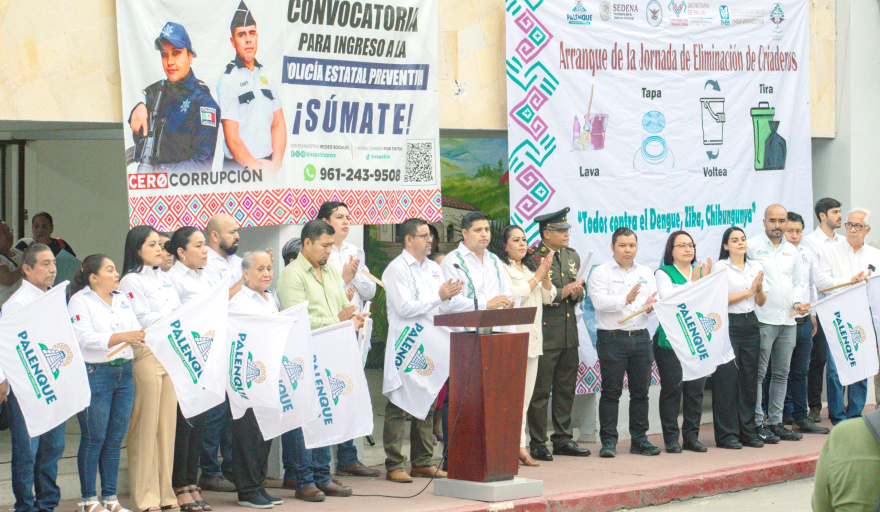Como parte del compromiso de atender las necesidades de la población, el H. Ayuntamiento de Palenque, que preside Jorge Cabrera Aguilar, a través de la Dirección de Salud Municipal, en coordinación con la Jurisdicción Sanitaria, y la 4/a. Compañía de Infantería No Encuadrada, llevaron a cabo el banderazo de inicio del programa “Todos Contra el Dengue”.