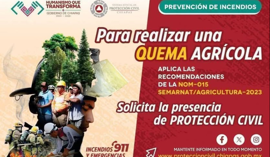 Con este llamado, la Secretaría de Protección Civil reitera su compromiso con la seguridad de los chiapanecos, el cuidado del medio ambiente y la promoción de una cultura de prevención que permita reducir los riesgos de incendios en el estado, protegiendo tanto la vida humana como la flora y fauna de Chiapas.