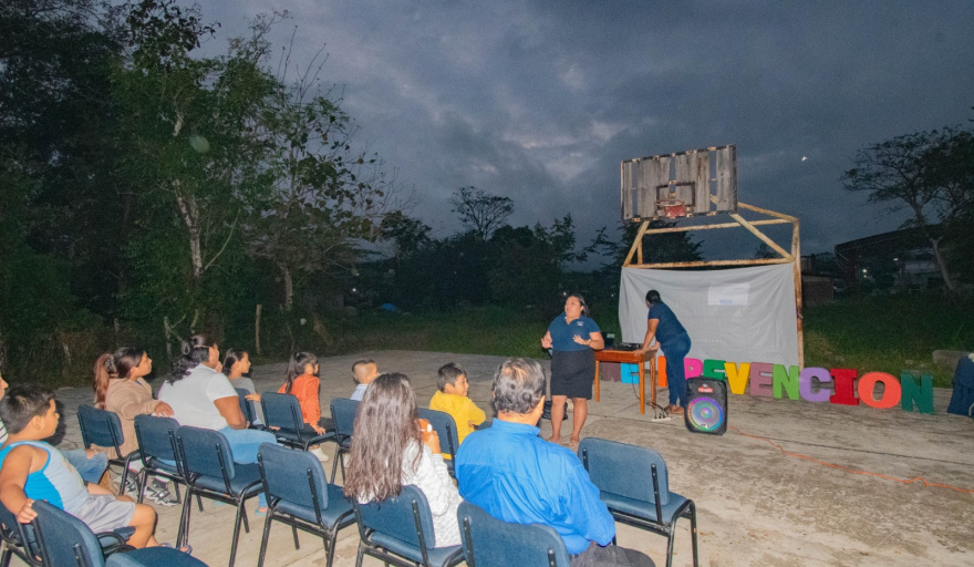 Con el objetivo de incentivar la reflexión, sensibilización, concientización e implementación de valores a la población, en materia de Prevención del Delito, con proyecciones de películas como un recurso didáctico, el H. Ayuntamiento Municipal de Palenque, Chiapas; a través de la Coordinación de Prevención del Delito, llevaron a cabo la actividad de “Cine Prevención”, en la cancha de usos múltiples de la colonia Bajluntié de esta cabecera municipal.