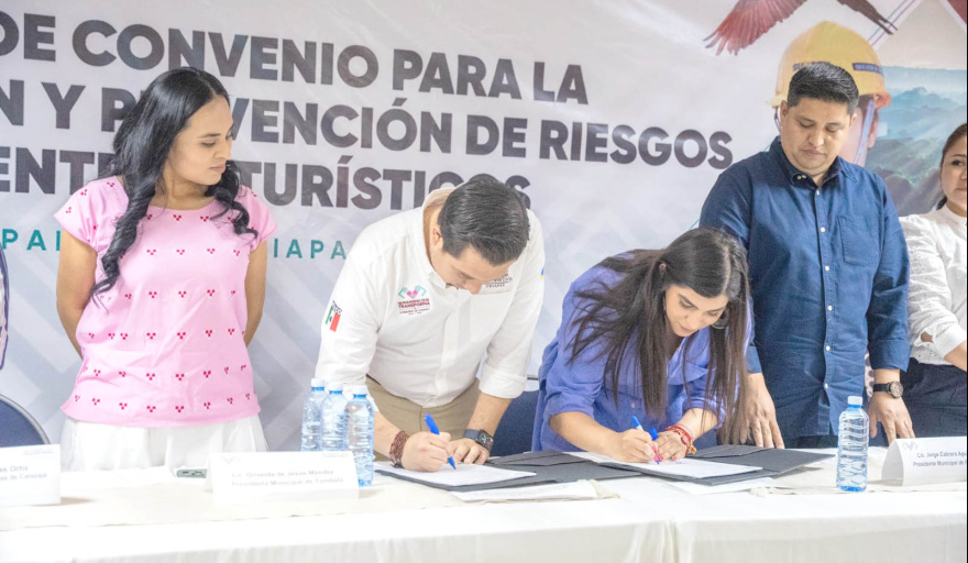 El presidente municipal de Palenque, Jorge Cabrera Aguilar, encabezó la firma de un importante convenio que tiene como objetivo la reactivación y prevención de riesgos en los centros turísticos de la región. El evento contó con la presencia de Maru Culebro, Secretaria de Turismo, y Mauricio Cordero, Secretario de Protección Civil del Estado, así como Anguie Cabrera, delegada de Turismo; Rosita Bacelis Lacroix, de Pueblos Mágicos, alcaldes de la región, empresarios y demás.