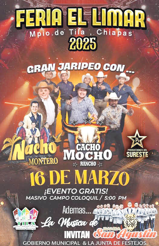 El H. Ayuntamiento de Tila, presidido por el Ing. Neiser Hernández López, invita a toda la población a disfrutar de la Feria El Limar 2025, un evento que promete grandes momentos de diversión para toda la familia. En esta ocasión, los asistentes podrán disfrutar de la presentación de Cacho Mocho, acompañado por la Banda San Agustín, quienes estarán en el Masivo del Campo Coloquil, ofreciendo un espectáculo completamente gratuito.