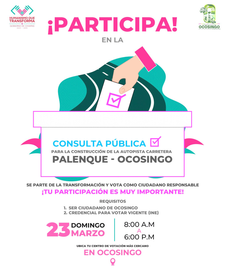 La presidenta municipal de Ocosingo Angélica Méndez, invita este próximo 23 de marzo a la Consulta Pública. ¡Haz historia y contribuye al desarrollo de nuestra región! Participa en la consulta pública como un ciudadano comprometido y haz realidad este importante proyecto.