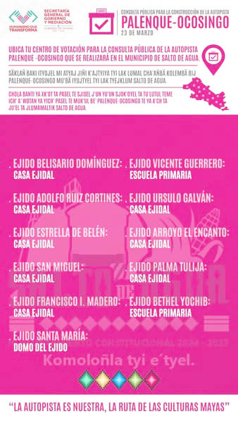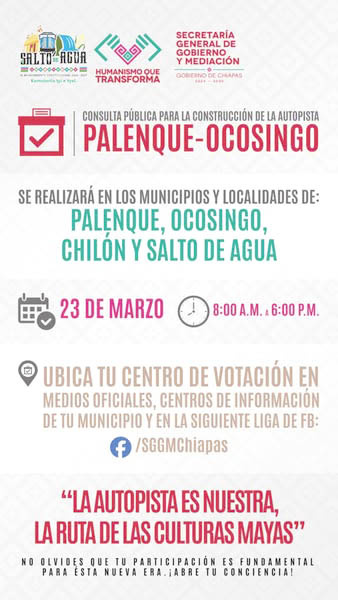 El H. Ayuntamiento de Salto de Agua, encabezado por el presidente Humberto Sánchez Díaz, invita a la población en edad de votar a participar en la Consulta Popular sobre la Autopista Palenque – Ocosingo, que se llevará a cabo el próximo 23 de marzo.