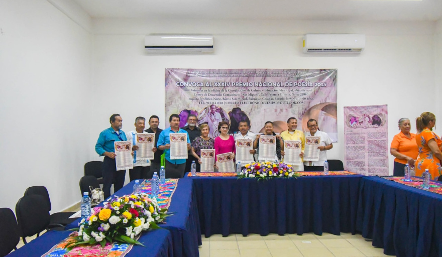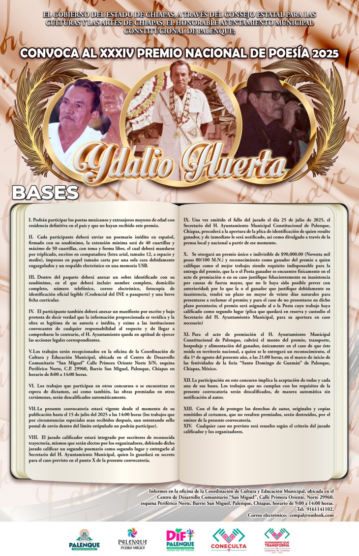 El H. Ayuntamiento Municipal de Palenque, presidido por Jorge Cabrera Aguilar, a través de la Coordinación de Cultura y Educación, presentó oficialmente la convocatoria para el Premio Nacional de Poesía Ydalio Huerta Escalante 2025. El evento, que contó con la presencia de familiares del poeta, autoridades municipales, escritores, público en general y medios de comunicación, busca reconocer a poetas mexicanos y extranjeros mayores de edad con residencia definitiva en el país que no hayan recibido este galardón anteriormente.