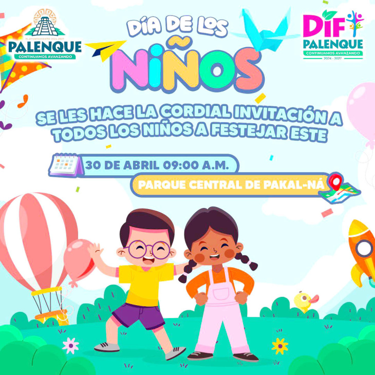 El Sistema para el Desarrollo Integral de la Familia (DIF) Municipal de Palenque ha extendido una cálida invitación a todas las familias de la región para unirse a la gran celebración del Día del Niño, que se llevará a cabo el próximo 30 de abril en el Parque Central de la colonia Pakal-Ná, a partir de las 9:00 de la mañana.