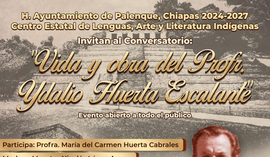 El Ayuntamiento de Palenque, Chiapas, invita cordialmente al Conversatorio “Vida y Obra del Profr. Ydalio Huerta Escalante”, un evento dedicado a recordar la trayectoria del destacado docente, figura clave en la historia educativa y cultural de la región.