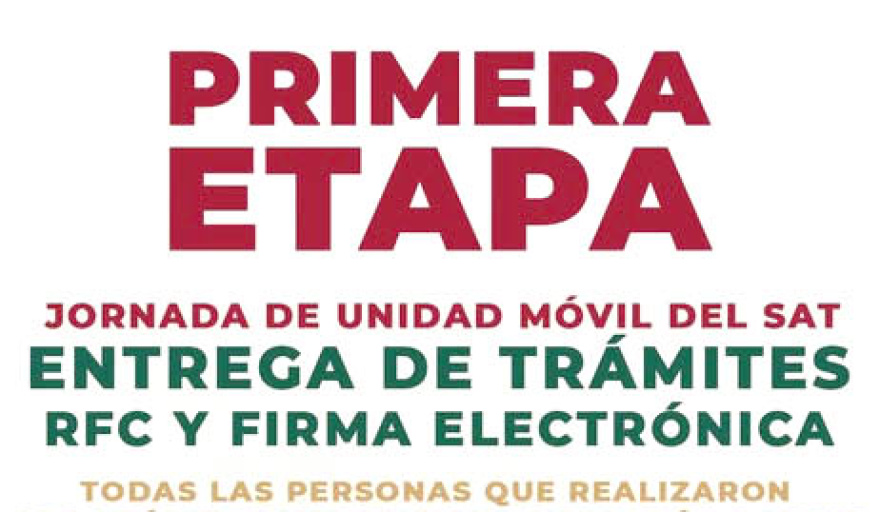 El H. Ayuntamiento Municipal de Palenque, que preside Jorge Cabrera Aguilar, informa a la ciudadanía en general que, en el marco de la Jornada de Unidad Móvil del SAT, se estarán entregando los trámites correspondientes al RFC y la firma electrónica a todas las personas que los hayan gestionado previamente.