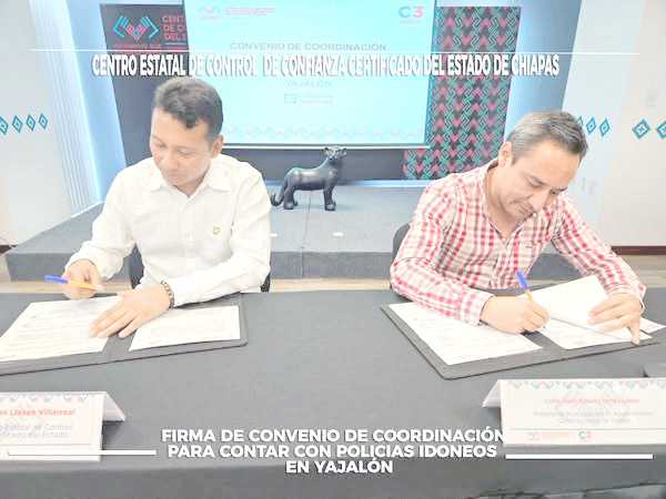 Con el objetivo de fortalecer la seguridad pública y garantizar la paz social en el municipio, el Presidente Municipal Constitucional de Yajalón, Juan Alberto Utrilla López, y el Director General del Centro Estatal de Control de Confianza Certificado (CECCC), Mtro. José Llaven, firmaron un importante convenio de coordinación.