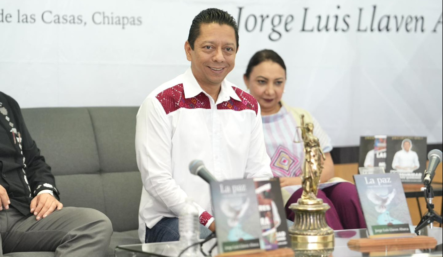El fiscal general de Chiapas, Jorge Luis Llaven Abarca, presentó su libro “La Paz Como Derecho Humano” ante estudiantes del Instituto de Estudios Superiores “Manuel José de Rojas” en San Cristóbal de Las Casas. Acompañado por su esposa Lupita Gómez, autoridades municipales y legisladores locales, destacó la importancia de construir una paz positiva en el estado.