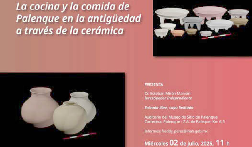 La conferencia abordará cómo, a través del estudio de la cerámica antigua, se puede reconstruir parte de la cultura alimentaria de Palenque, revelando ingredientes, utensilios y prácticas de cocina que formaron parte esencial de la vida cotidiana en esta antigua ciudad prehispánica.