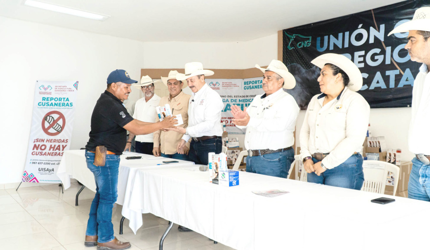 Como parte de las estrategias para fortalecer la sanidad pecuaria en Chiapas, se llevó a cabo en el municipio de Palenque la entrega de kits contra el Gusano Barrenador del Ganado (GBG), dirigidos a personal técnico y productores ganaderos de la región.