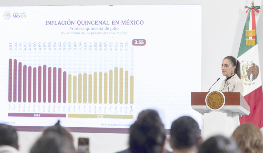La presidenta Claudia Sheinbaum Pardo, dio a conocer en la mañanera del pueblo que la inflación en México se moderó en la primera mitad de julio más de lo previsto, aunque el índice subyacente continuó por encima de la meta del Banxico, respaldando las perspectivas de que reducirá el ritmo de sus recortes a la tasa de interés.