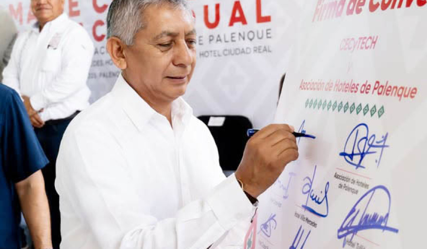 El presidente municipal de Palenque Jorge Cabrera Aguilar, acompañó al director general del CECyTE Chiapas, Luis Guadalupe Morales Ángeles, a la Firma del Convenio de Educación Dual entre el CECyTECH y la Asociación de Hoteles y Moteles de Palenque, con el firme propósito de fortalecer los lazos de colaboración entre el sector educativo y el sector turístico de la región, impulsando así más oportunidades de formación y desarrollo para los jóvenes.