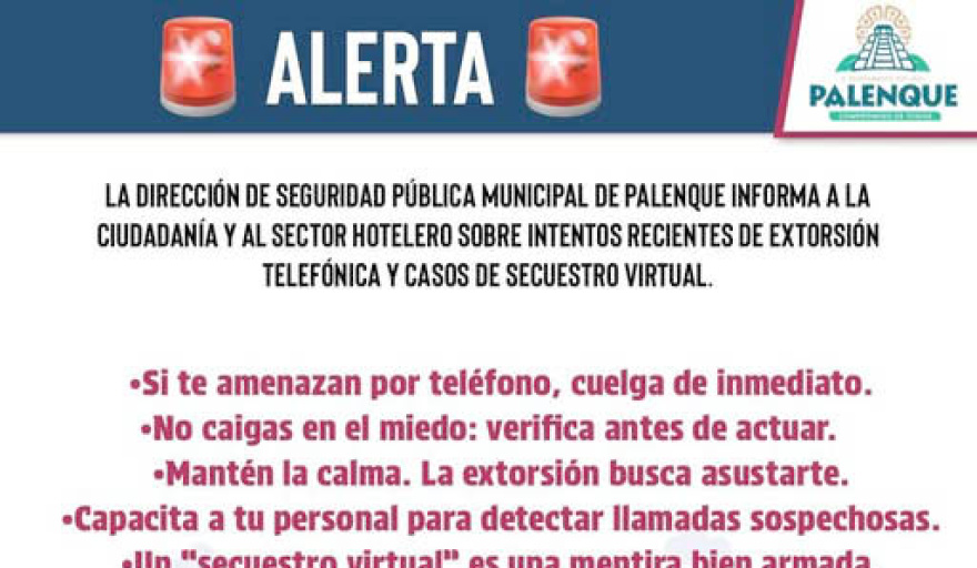 El H. Ayuntamiento Municipal de Palenque, a través de la Dirección de Seguridad Pública Municipal, lanzó un llamado urgente a la población en general y de forma particular al sector hotelero, tras detectar recientes intentos de extorsión telefónica y casos de secuestros virtuales en la región.