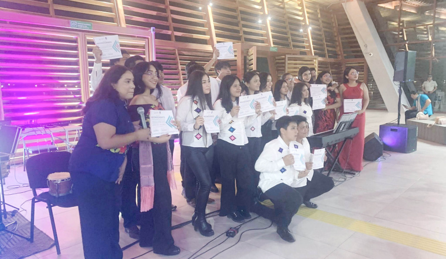 La maestra Emily Margarita Frías Córdoba, responsable del taller de canto, recibió un reconocimiento especial por parte de la Casa de la Cultura por su compromiso, dedicación y calidad en la formación artística de las alumnas. Gracias a su coordinación con madres, padres de familia y personal logístico, el evento transcurrió con gran éxito.