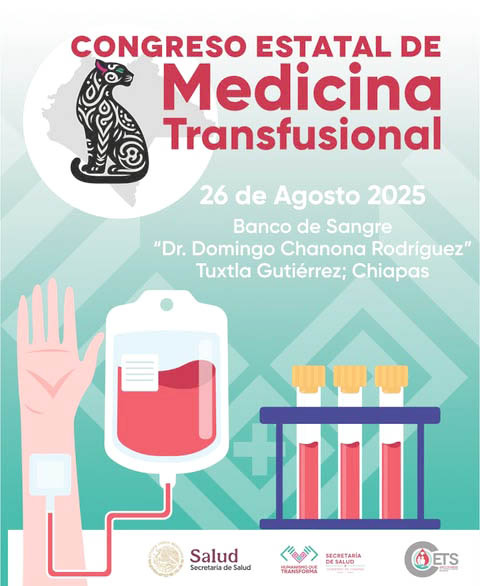 La SecretarÃa de Salud del Estado lanzó la invitación oficial para participar en el Congreso Estatal de Medicina Transfusional, que se llevará a cabo los dÃas 25 y 26 de agosto de 2025 en la ciudad de Tuxtla Gutiérrez.