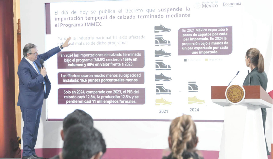 En la mañanera del pueblo con la presidenta Claudia Sheinbaum, el secretario de Economía, Marcelo Ebrard anunció que a partir de hoy se implementará el decreto que suspende la importación temporal del calzado, que implica la imposibilidad de no traer calzado terminado a México a menos que pague impuestos.