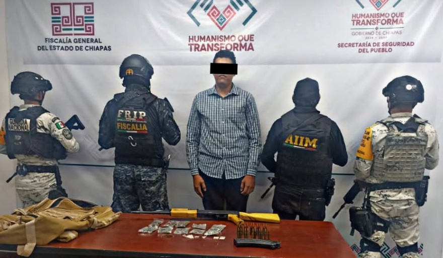 El grupo internacional, conformado por la Fiscalía General del Estado, la Guardia Nacional y la Secretaría de Seguridad del Pueblo, detuvieron en flagrancia a Eduardo “N”, como presunto responsable de los delitos contra la salud y violación a la Ley Federal de armas de fuego y explosivos, por hechos ocurridos en el municipio de Mapastepec.