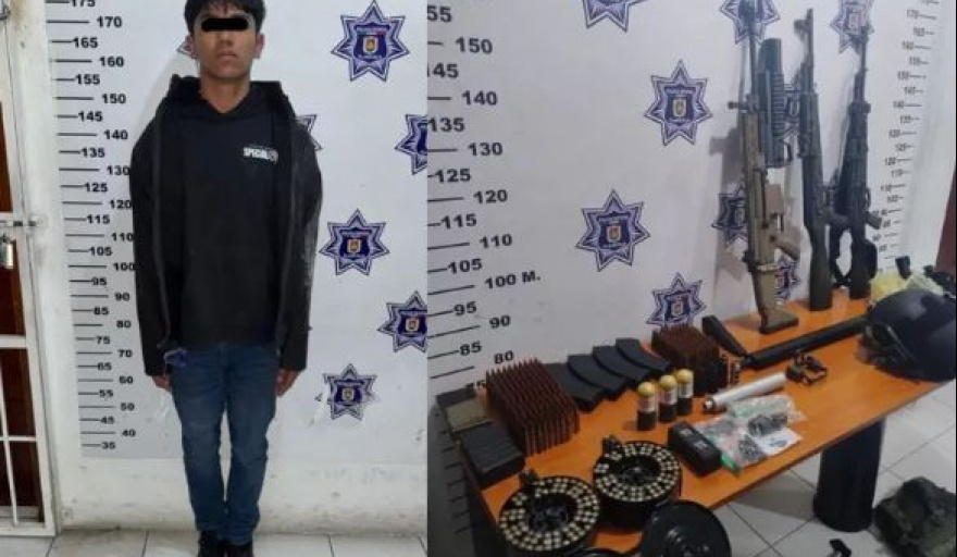 En Apizaco, Tlaxcala, detuvieron a un joven de 18 años que transportaba un arsenal, lanzagranadas, explosivos y equipo táctico en una camioneta robada.
