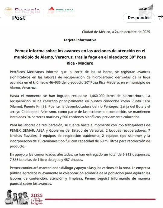 Petróleos Mexicanos informa que, al corte de las 18 horas, se registran avances significativos en las labores de recuperación de hidrocarburo derivadas de la fuga ocurrida en el kilómetro 46+935 del oleoducto 30” Poza Rica-Madero, en el municipio de Álamo, Veracruz.