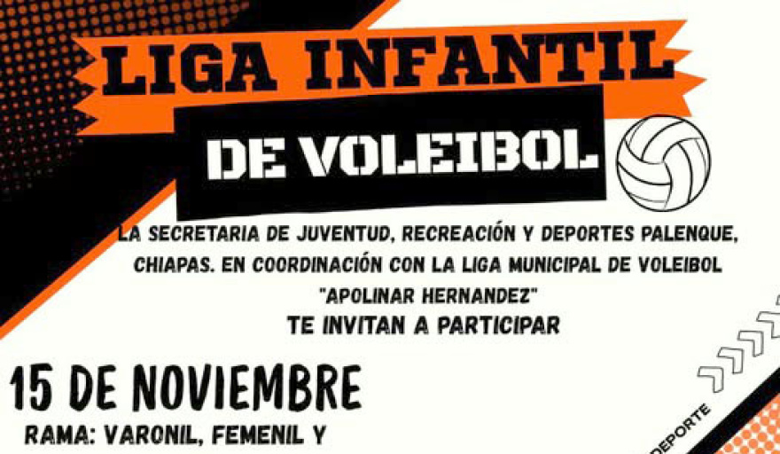 La Secretaría de Juventud, Recreación y Deportes de Palenque, en coordinación con la Liga Municipal de Voleibol "Apolinar Hernández", invita a la comunidad infantil a inscribirse en la liga infantil de voleibol 2025, que contará con las ramas varonil, femenil y mixta.