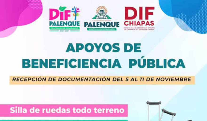 El DIF Municipal de Palenque informó que del 5 al 11 de noviembre se estarán recepcionando documentos en sus oficinas para la entrega de diversos apoyos funcionales dirigidos a personas que los necesiten.