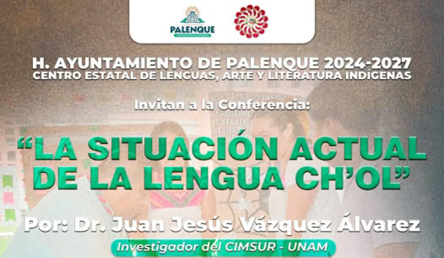 El H. Ayuntamiento de Palenque, en coordinación con el Centro Estatal de Lenguas, Arte y Literatura Indígenas, invita a la ponencia titulada “La situación actual de la lengua Ch’ol”, a cargo del Dr. Juan Jesús Vázquez Álvarez, investigador del CIMSUR-UNAM.