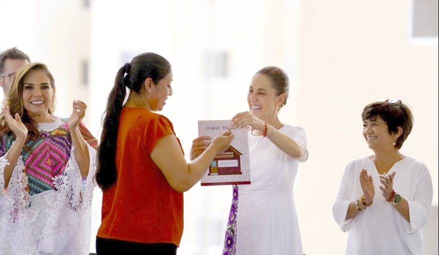 En Playa del Carmen, Quintana Roo, la Presidenta Claudia Sheinbaum Pardo encabezó la entrega de 225 viviendas nuevas del Instituto del Fondo Nacional de la Vivienda para los Trabajadores (Infonavit), como parte del programa Vivienda para el Bienestar, además de 497 liberaciones de hipoteca del Fondo de Vivienda del Instituto de Seguridad y Servicios Sociales (Fovissste) y 193 escrituras del Instituto Nacional del Suelo Sustentable (INSUS).
