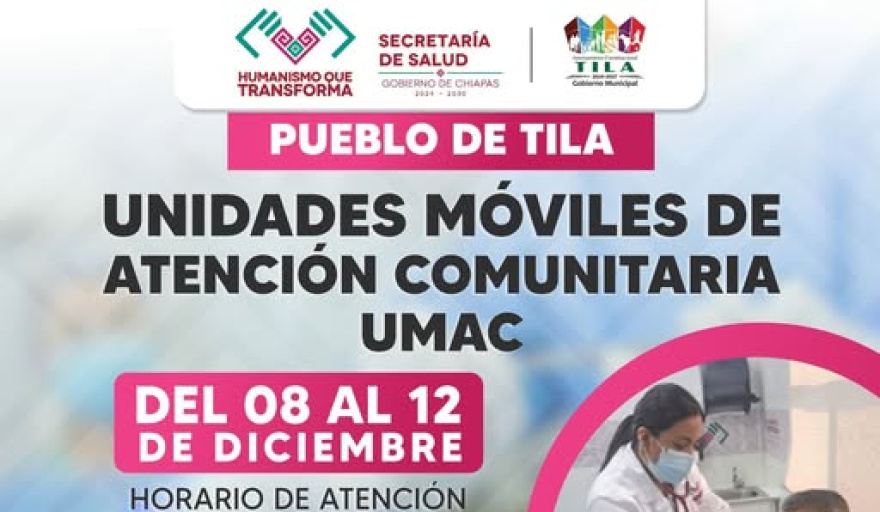 El Ayuntamiento Constitucional de Tila, en coordinación con la Secretaría de Salud Chiapas, anunció la llegada de las Unidades Móviles de Atención Comunitaria (UMAC) al municipio, con el propósito de acercar servicios médicos gratuitos a la población. La atención se brindará del 8 al 12 de diciembre en la sede ubicada en el Campo de Fútbol del COBACH 14, en el Pueblo de Tila.