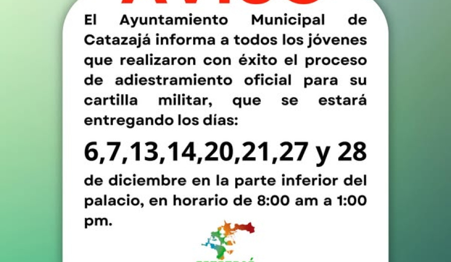 El H. Ayuntamiento de Catazajá dio a conocer a los jóvenes que realizaron el trámite de su cartilla del Servicio Militar Nacional que la entrega de la hoja de liberación se llevará a cabo durante los días 6, 7, 13, 14, 20, 21, 27 y 28 de diciembre.
