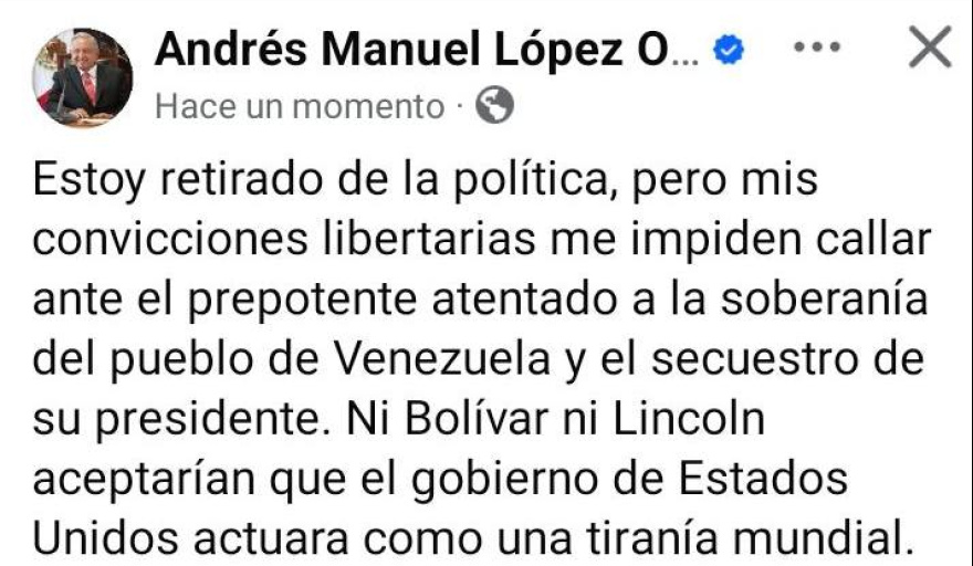 Estoy retirado de la política, pero mis convicciones libertarias me impiden callar ante el prepotente atentado a la soberanía del pueblo de Venezuela y el secuestro de su presidente. Ni Bolívar ni Lincoln aceptarían que el gobierno de Estados Unidos actuara como una tiranía mundial.
