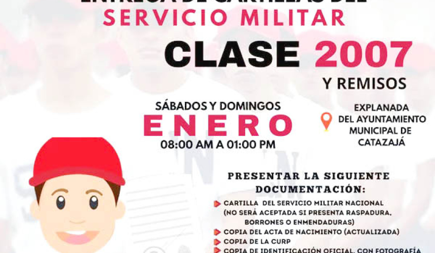 El Ayuntamiento Municipal de Catazajá emitió un aviso dirigido a los jóvenes clase 2007 y remisos que realizaron su trámite del Servicio Militar Nacional durante el año 2025, para que acudan a recoger su cartilla en las fechas oficiales establecidas.