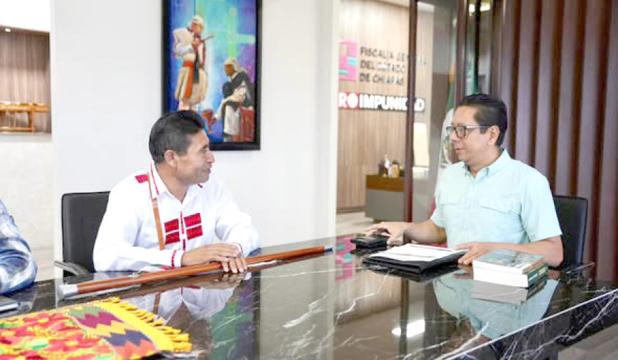 El fiscal general del estado, Jorge Luis Llaven Abarca, sostuvo una reunión de trabajo con el presidente municipal de Oxchuc, César Gómez López, en las instalaciones de la Fiscalía General del Estado, con el objetivo de consolidar acciones a favor de la seguridad y la paz social en este municipio.