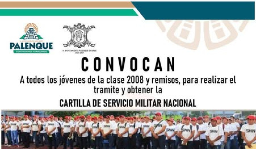 El H. Ayuntamiento de Palenque informó que a partir del lunes 12 de enero y hasta el 15 de octubre de 2026, se llevará a cabo el trámite de la Cartilla de Servicio Militar Nacional para la Clase 2008 y remisos.