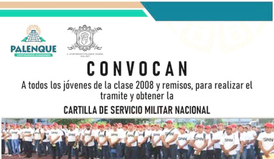 El H. Ayuntamiento de Palenque informó que a partir del lunes 12 de enero y hasta el 15 de octubre de 2026, se llevará a cabo el trámite de la Cartilla de Servicio Militar Nacional para la Clase 2008 y remisos.