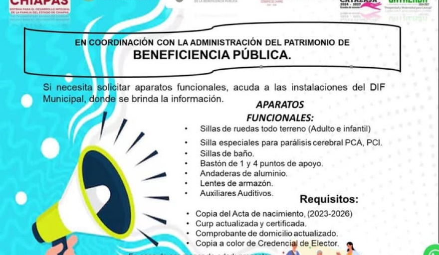 El H. Ayuntamiento de Catazajá invita a la ciudadanía que requiera aparatos funcionales a acudir a las instalaciones del DIF Municipal, donde se brinda información detallada sobre los apoyos disponibles y los requisitos para acceder a ellos.