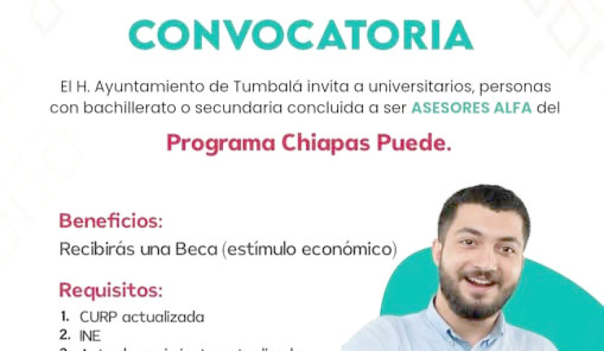 El H. Ayuntamiento Municipal de Tumbalá, en coordinación con el Gobierno del Estado de Chiapas, a través del programa ALFA – Chiapas Puede, invita a las personas interesadas a participar como asesores de alfabetización.