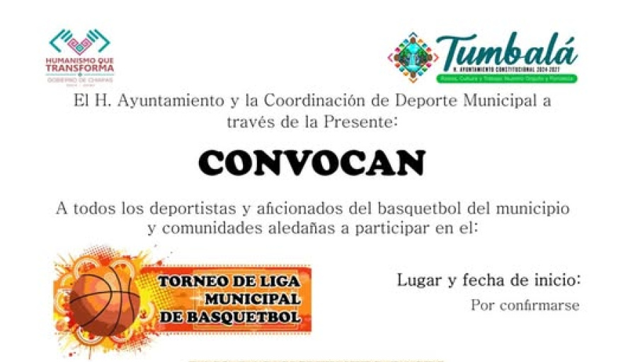 El H. Ayuntamiento Municipal de Tumbalá, en coordinación con el área de Deporte Municipal, lanzó la convocatoria oficial para participar en el Torneo de Liga Municipal de Básquetbol, una iniciativa que busca impulsar la práctica deportiva y fomentar la sana competencia entre la población.