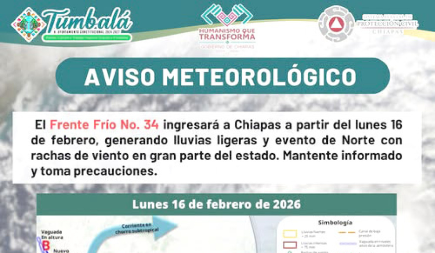 El H. Ayuntamiento de Tumbalá dio a conocer que el Frente Frío No. 34 ingresará a Chiapas a partir de este lunes 16 de febrero, provocando lluvias ligeras, evento de Norte y rachas de viento en distintas zonas del estado, por lo que se exhorta a la población a mantenerse atenta a la información oficial.