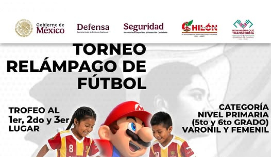 El Torneo Relámpago de Fútbol “Jornada por la Paz” se llevará a cabo los días 16 y 17 de abril a partir de las 9:00 de la mañana en la cancha de Fut 7 de Bachajón. Este esfuerzo es resultado del trabajo conjunto del Honorable Ayuntamiento de Chilón, en coordinación con instituciones de seguridad, para seguir construyendo espacios donde la niñez pueda jugar de manera libre, segura y con un futuro prometedor.
