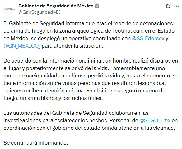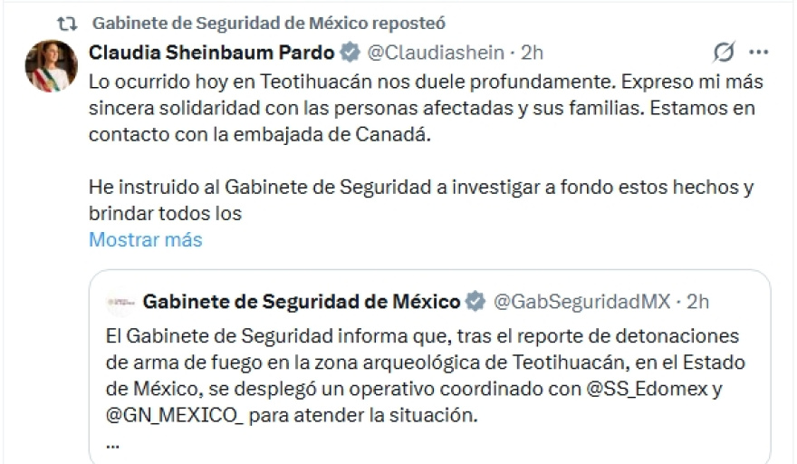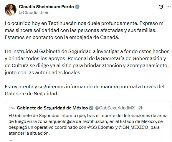 La presidenta Claudia Sheinbaum Pardo expresó su solidaridad con las personas afectadas y sus familias tras lo ocurrido este día en Teotihuacán.
