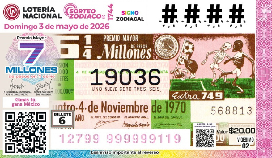 El Sorteo Zodiaco No. 1744 se realizará el domingo 3 de mayo de 2026, a las 20:00 horas; reparte un Premio Mayor de 7 millones de pesos en una serie y tiene una bolsa de 24 millones de pesos en premios, su transmisión será en vivo por el canal de YouTube institucional Sorteos Tradicionales de la Lotería Nacional. Los cachitos 5 y 6 ya se encuentran disponibles en los puntos de venta de Lotería Nacional, en milotería.mx y en la App MiLotería.